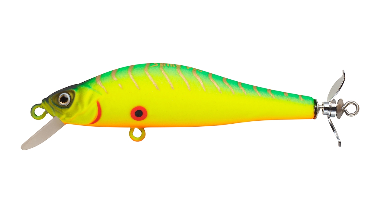 Пропеллер, который был разработан специально для этой приманки, по-настоящему уникальный, не только потому, что он ассиметричный, но и благодаря звуку, который слышится, когда плывет приманка, и возможности создавать брызги.